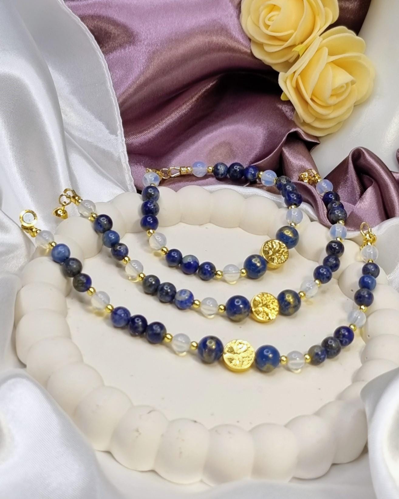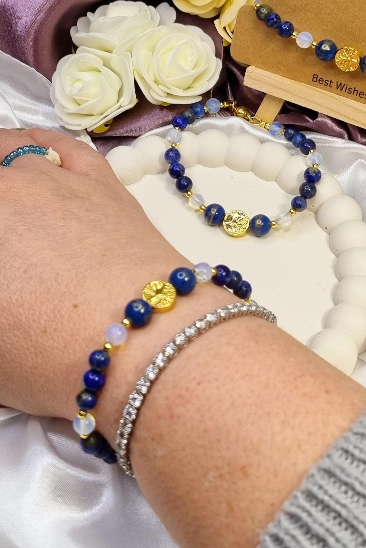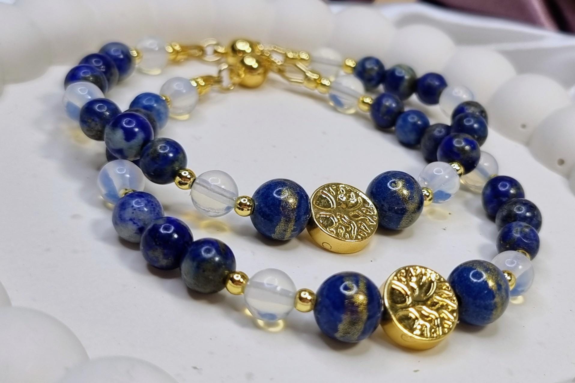 This handcrafted bracelet combines shimmering lapis lazuli with delicate opalite and is complemented at its center by two blue-gold calcite beads and a hematite bead with a tree of life motif. A harmonious combination of depth, light, and meaning – timeless, elegant, and perfect for everyday wear.