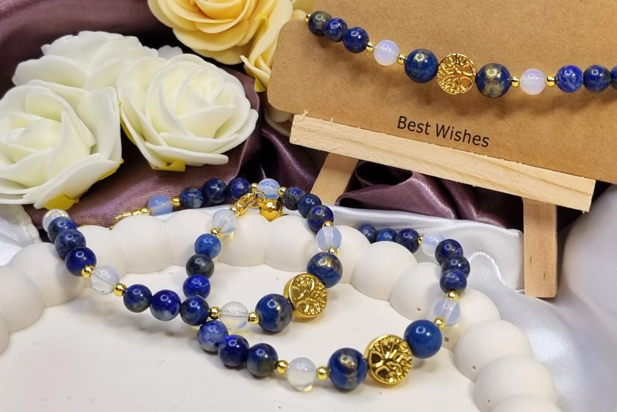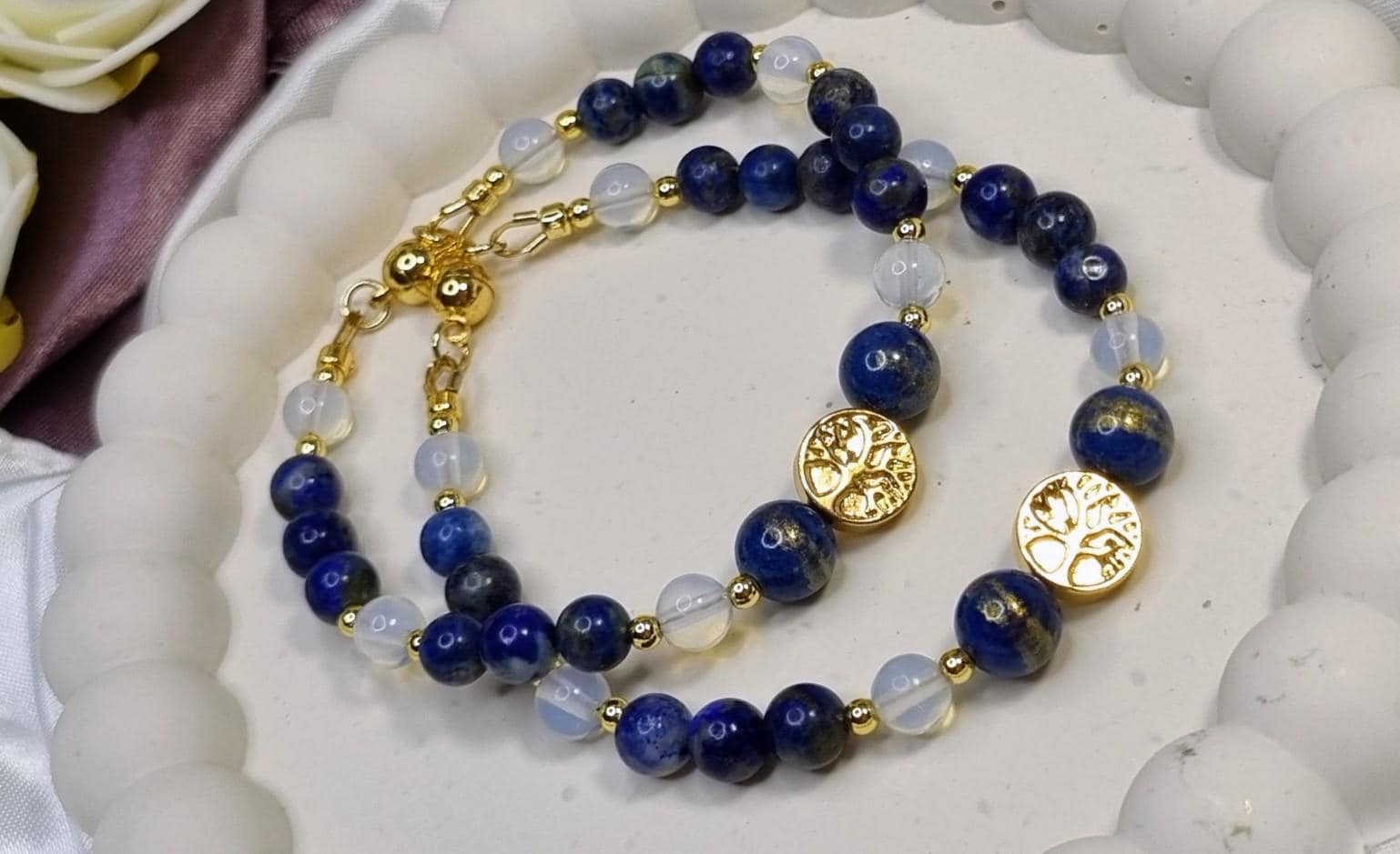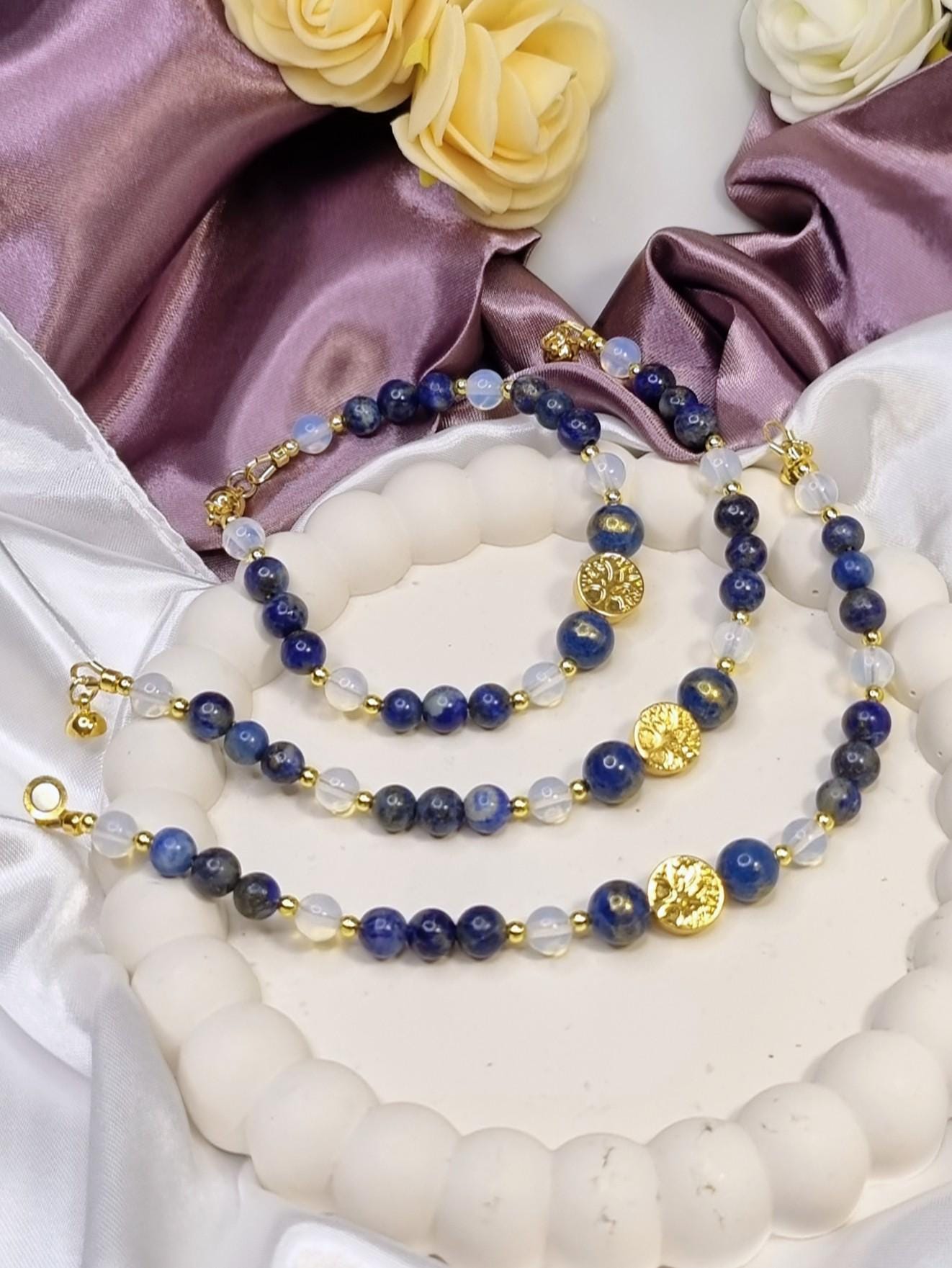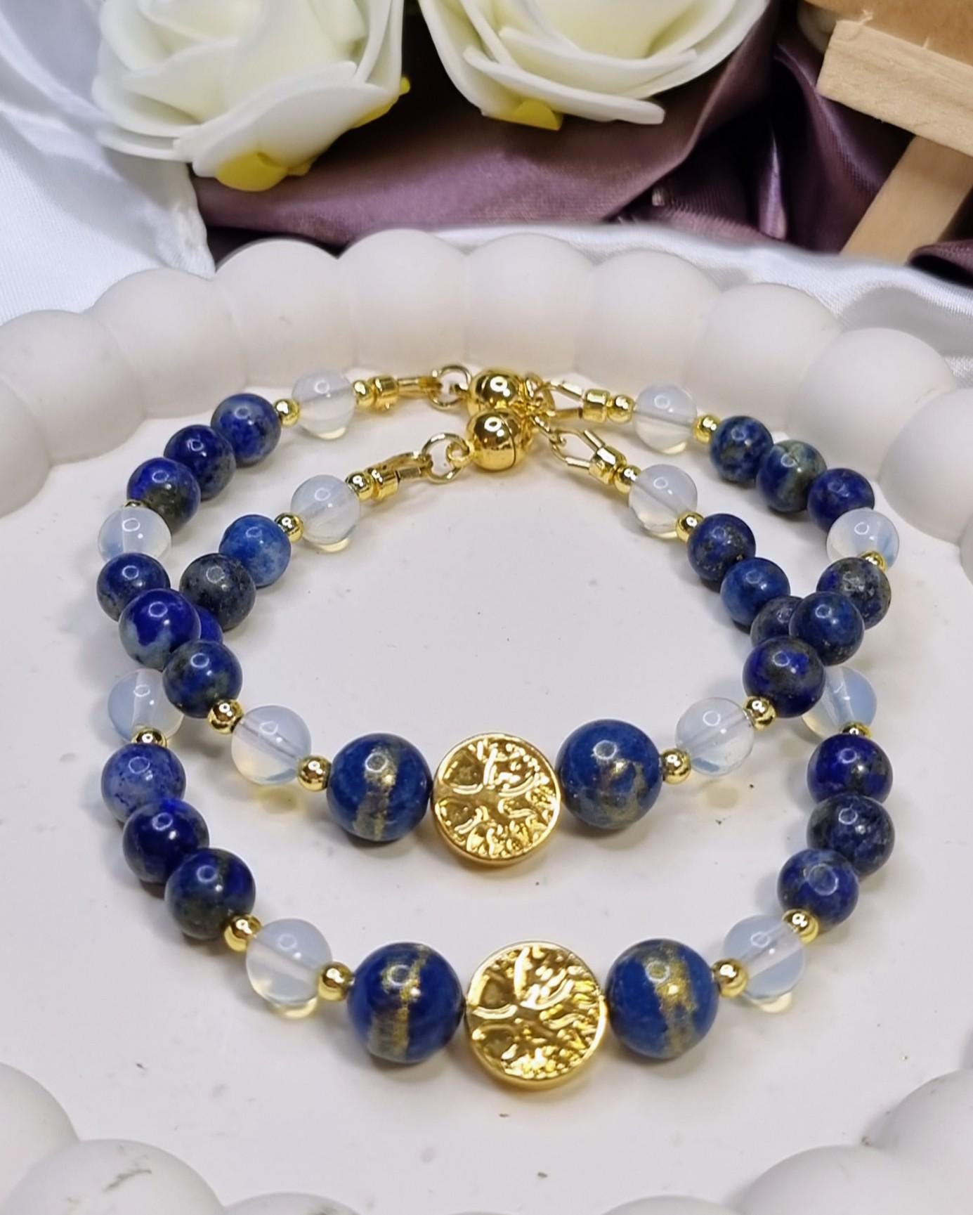 This handcrafted bracelet combines shimmering lapis lazuli with delicate opalite and is complemented at its center by two blue-gold calcite beads and a hematite bead with a tree of life motif. A harmonious combination of depth, light, and meaning – timeless, elegant, and perfect for everyday wear.