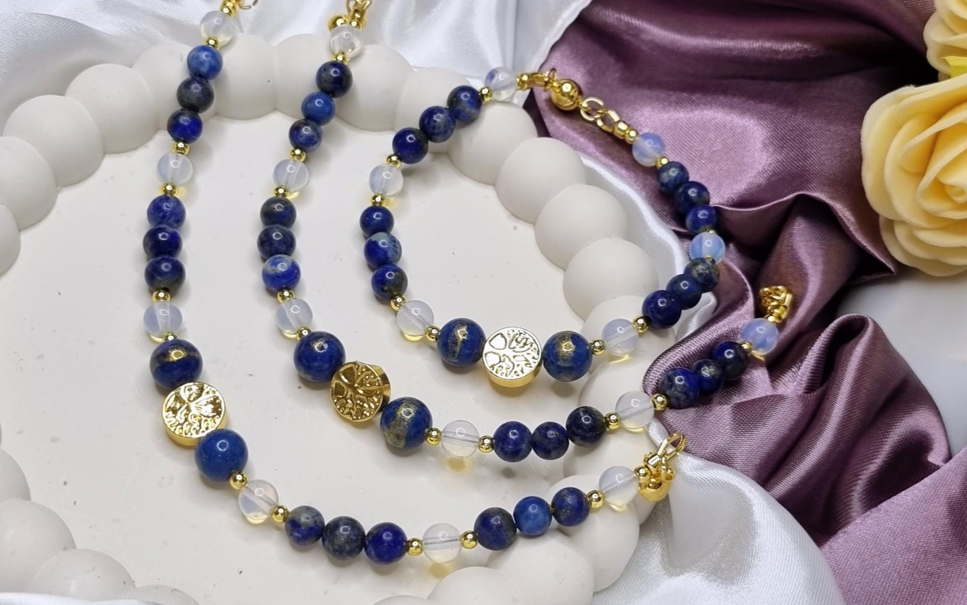 • Materials: 18k gold-plated stainless steel, lapis lazuli (6 mm, 12 beads), opalite (6 mm, 6 beads), blue gold calcite (8 mm, 2 beads), hematite arborvitae